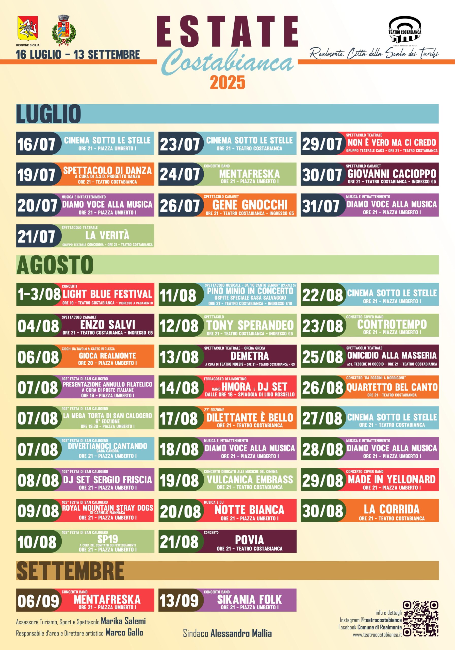 «Questo cartellone è un primo gesto concreto di vitalità e partecipazione per Realmonte» – afferma il sindaco Alessandro Mallia – «Ringrazio l’assessore Salemi e Marco Gallo per l’impegno profuso e per la visione condivisa. Abbiamo puntato su eventi semplici ma curati, per restituire alla città occasioni di incontro, socialità e divertimento. È solo l’inizio, ma è un inizio in cui crediamo molto.»