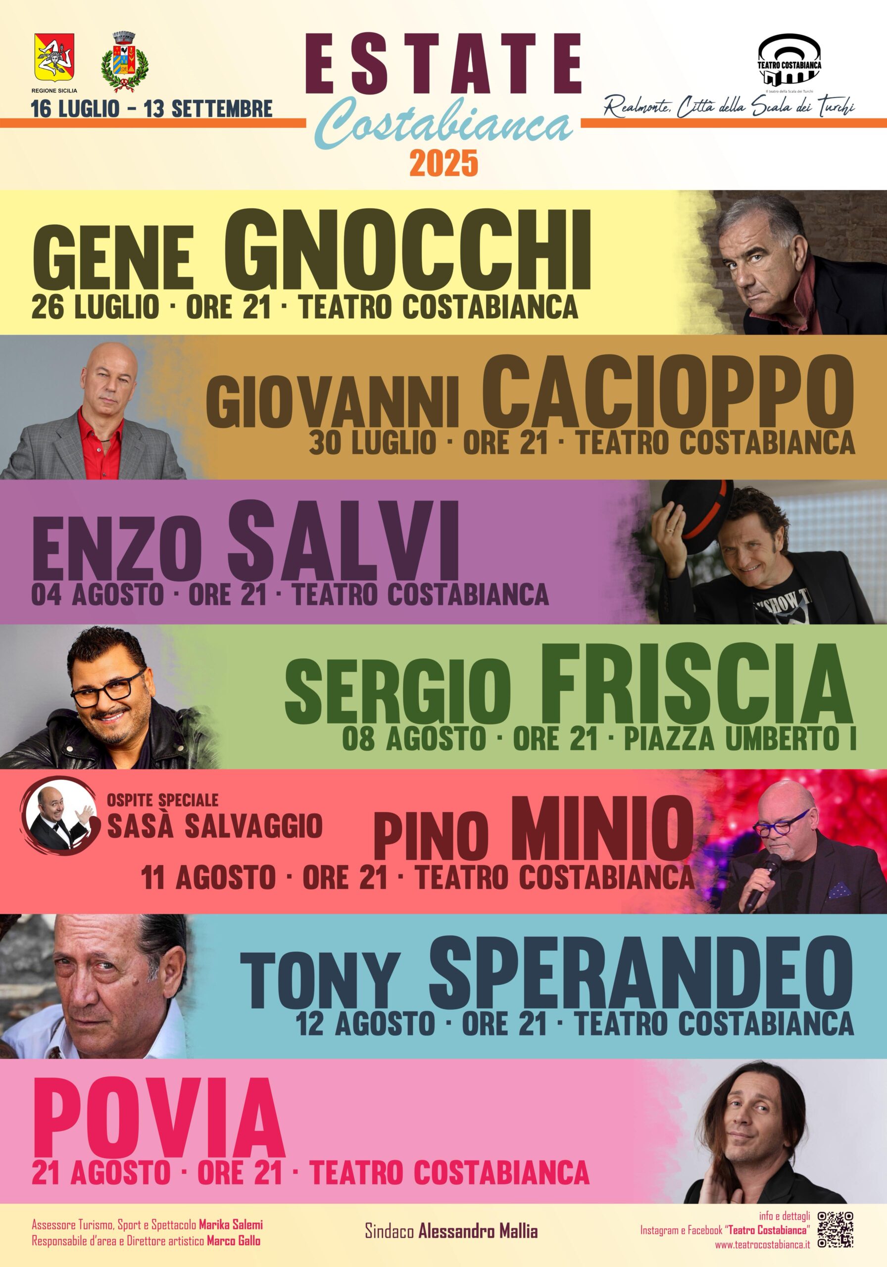 Tra gli ospiti più attesi figurano Gene Gnocchi, Giovanni Cacioppo, Enzo Salvi, Tony Sperandeo e Povia, accanto a momenti musicali come quelli con Mentafreska, Sikania Folk e Controtempo. Completano il programma le serate di cinema sotto le stelle, i classici “Dilettante è bello”, la Notte Bianca, eventi per bambini e famiglie, oltre a numerosi spettacoli di musica dal vivo, teatro e comicità.